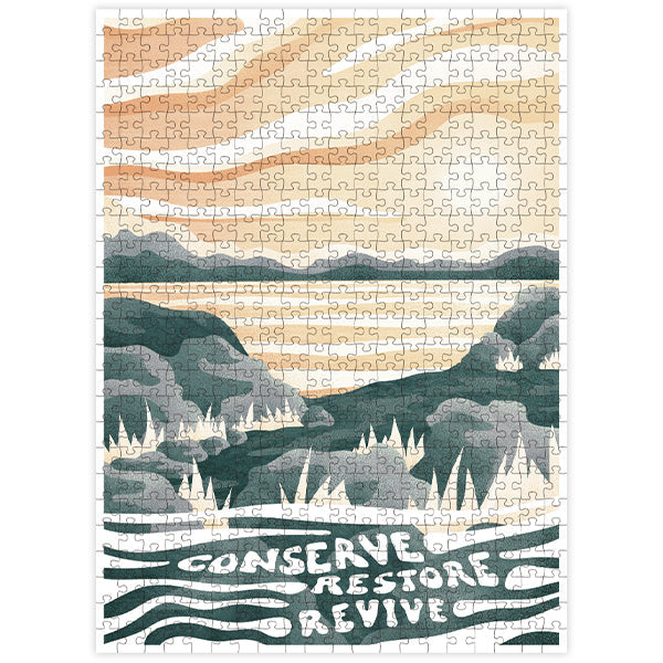 Combine a love for the planet and a favorite pastime with the EarthHero x Jiggy Puzzle! This 500 piece puzzle is made right here in the USA from 100% recyclable paper chipboard. Printed with water-based inks, each piece connects to create a warm coastal scene and the words 'Conserve, Restore, Revive'. Once complete, choose to store the pieces in the included drawstring bag or glue down the board for a permanent art fixture. A great addition to a coffee table or framed on the wall! Original artwork by Tyler Orbin.