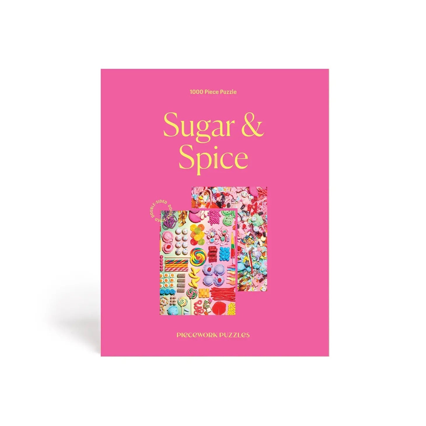 A puzzle that makes every piece count — twice! Double trouble or double delight? Piecework’s first two-sided puzzle features the ultimate candy crush: an organized array of sweets and treats on one side and a satisfying smash on the other. Worried about the challenge? One side is glossy and the other is matte. Random ribbon-cut pieces