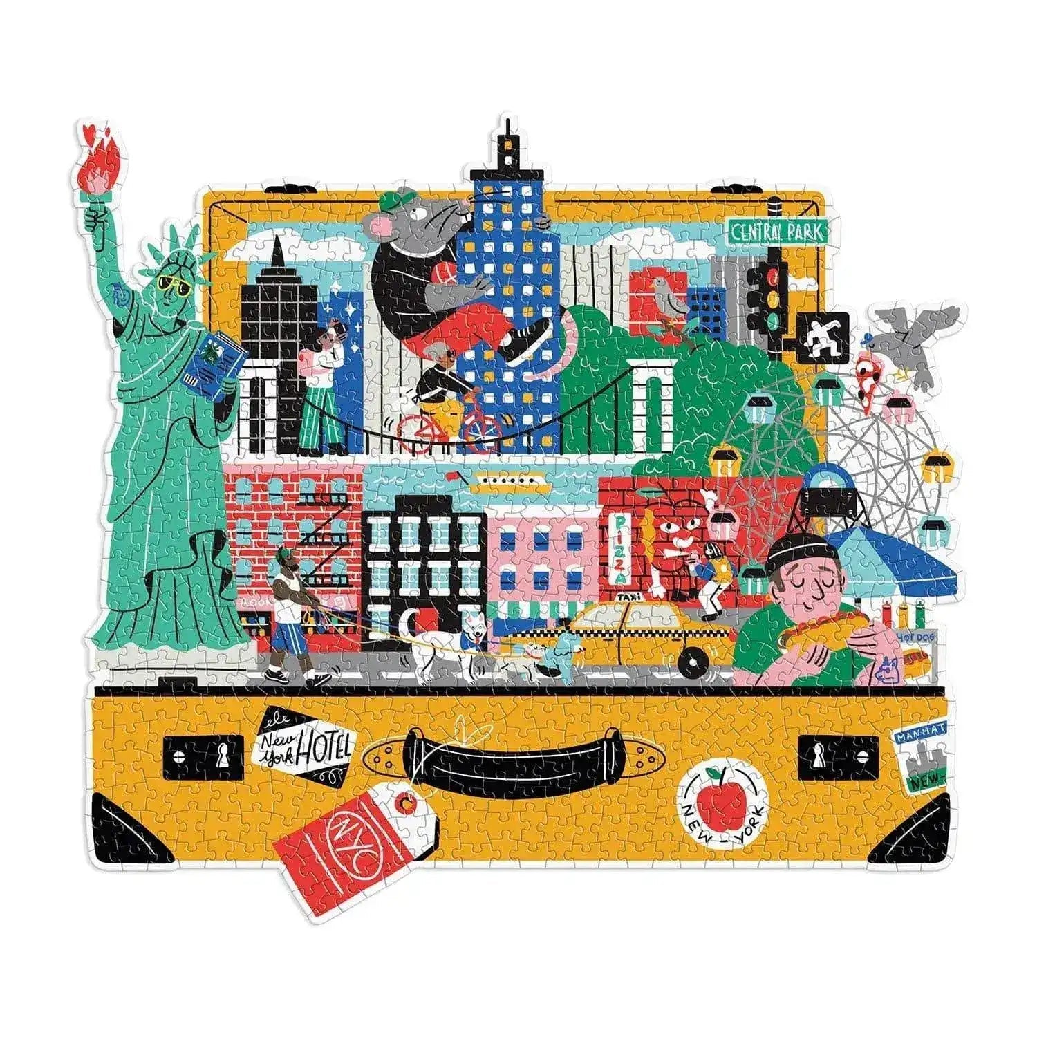 The City That Never Sleeps 750 Piece Shaped puzzle illustrates the wonders of a tourist visiting New York City, popping out of a vintage suitcase. Perfect for the puzzler who loves to travel the world while puzzling. These puzzles are packaged in matte-finish sturdy boxes, perfect for gifting, reuse, and storage.
