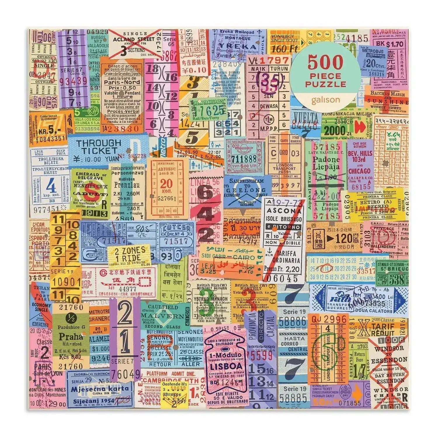 The Vintage Travel Tickets 500 Piece Puzzle features an illustrated collage by artist and designer Troy Litten. Echoing the romance of a bygone era, Litten celebrates the charm of vintage bus, train, metro, tram, and trolley tickets, evoking the simple joy of journeying with a beautiful piece of paper in your pocket. An insert of the full puzzle image with information about Troy Litten is included. These puzzles are packaged in matte-finish sturdy boxes, perfect for gifting, reuse, and storage.
