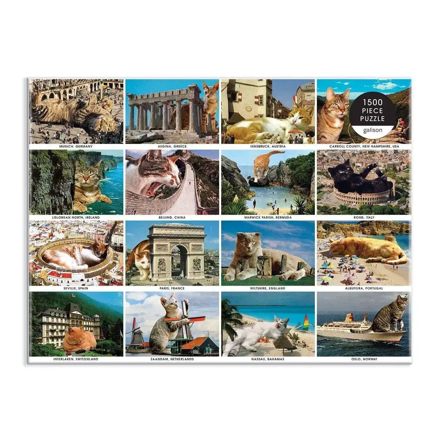 The Vacation Cats 1500 Piece Puzzle features a grid of 16 super-imposed photos of cats enjoying some of the world's most famous locations and landmarks. These puzzles are packaged in matte-finish sturdy boxes, perfect for gifting, reuse, and storage. An insert of the full puzzle image is also included.